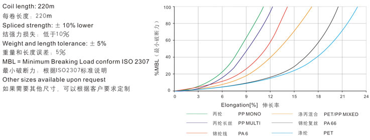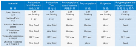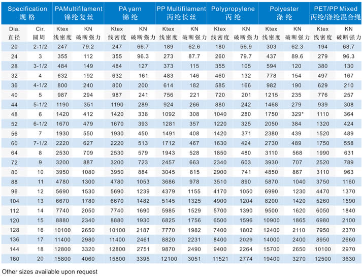 品種有錦綸復絲()、丙綸長絲()、丙綸、滌綸、丙綸/滌綸混合等系列產品。產品編織結構合理、工藝科學、具有高強力、低伸長、耐磨損、操作簡便等優點,特別適宜制作大規格繩索。同時可生產防靜電繩索等優點而受用戶的青睞主要用于各類船舶配備,漁業捕撈、港口裝卸、電力施工、石油勘探、體育用品、國防科研等領域。